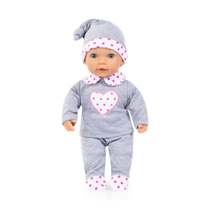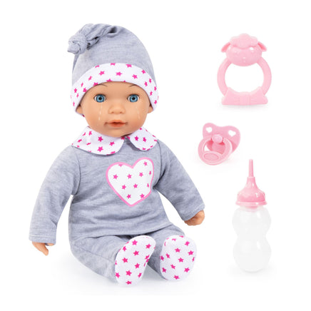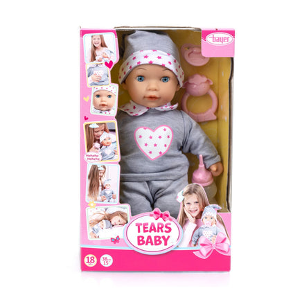 Tears Baby Doll 38cm tall with crying & Laughing sounds. The doll cries real tears after she is fed with water and Laughs and cries activated by pressing the tummy. Tears Baby Doll wears a cute dress with matching cap, pacifier, bottle, sheep rattle are included in set.