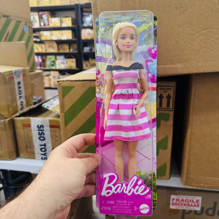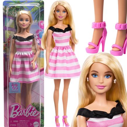 • Mattel - Barbie 65th Anniversary Fashion Doll with Blonde Hair, Pink Striped Dress and Accessories