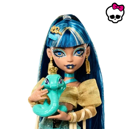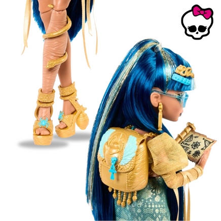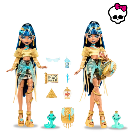 This Monster High doll makes quite a fashionable mummy! Cleo de Nile is wrapped from head-to-toe in her regally chic style. This mummy's style is pure gold! Cleo De Nile wears a shimmery blouse with mummy wrap ribbon fringe on the sleeves. A layered hieroglyph skirt, snake leg cuff, and scarab sandals complete her lurk! Her creeperific cobra Hissette is ready to join in on spooky adventures, too! With her poseable body and scary-chic storytelling accessories, Cleo de Nile doll is a faboolous gift for kids 4 years old and up. Fully articulated.