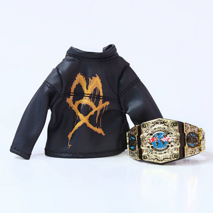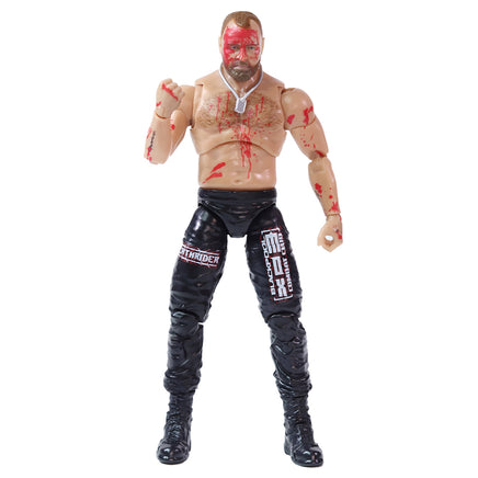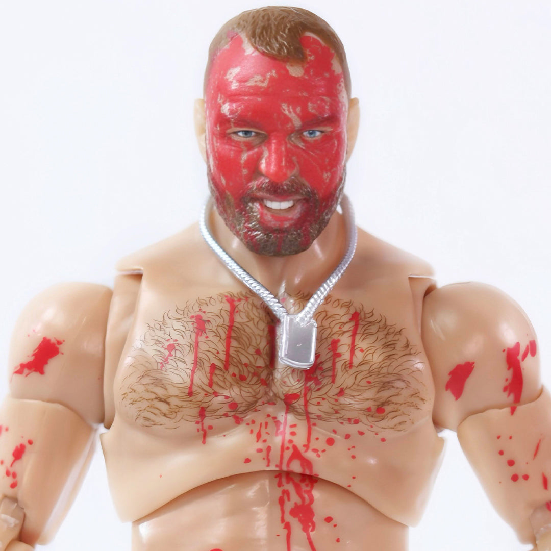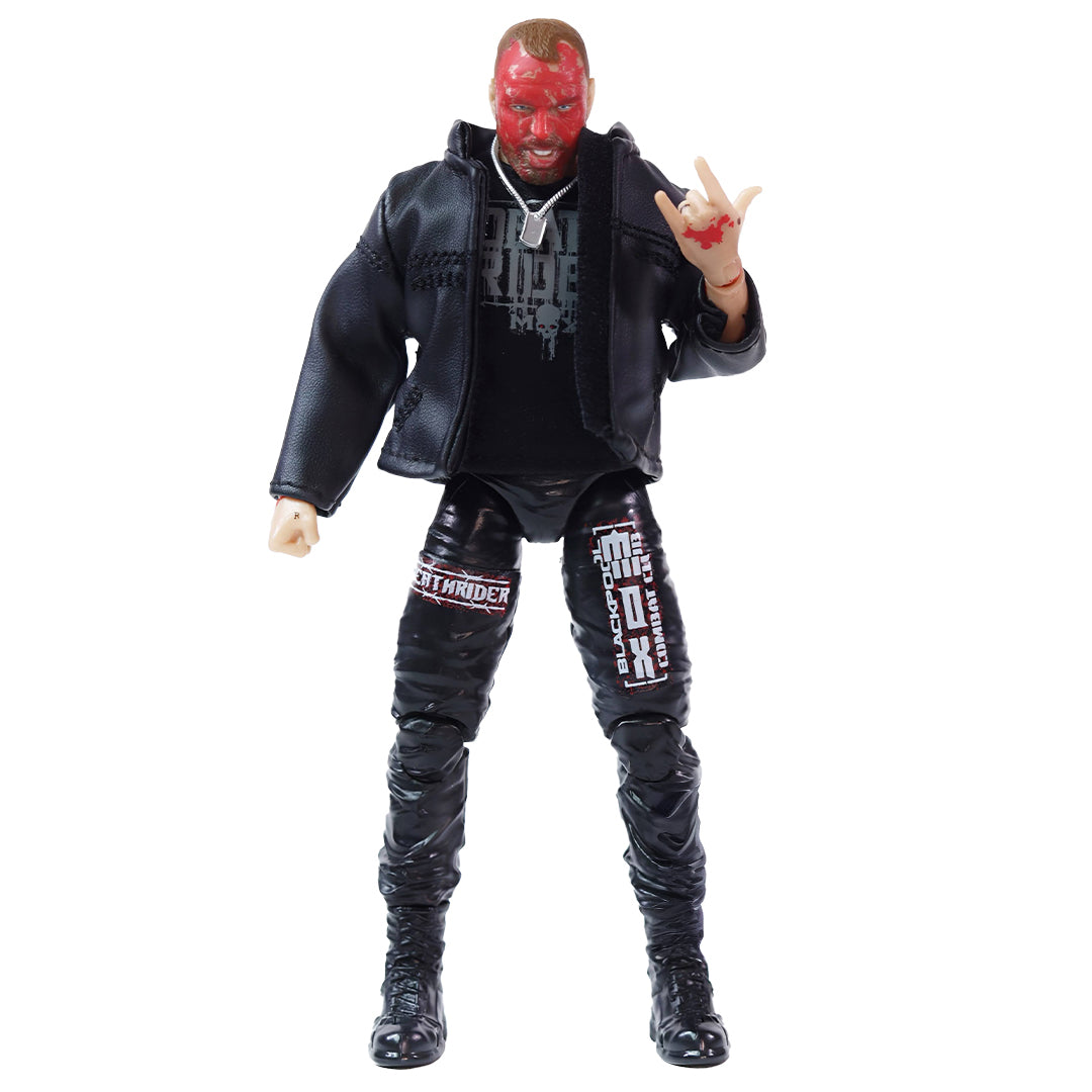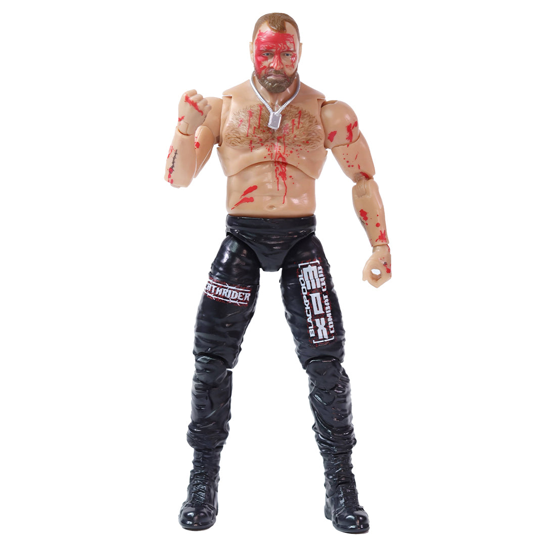 Wear the crimson mask with the Jon Moxley (Supreme Blood & Guts) Jazwares AEW action figure, exclusive to Ringside Collectibles! The AEW Blood & Guts exclusive series commemorates the most extreme moments in AEW’s history with unique bloody deco. The most extreme force in AEW takes his opponents and himself to the limit again with three unique, intense headscans, all featuring various levels of bloodshed. Moxley comes ready to brawl in black Mox and Blackpool Combat Club logo pants and black boots, and has blood-splatter deco on his chest and arms to simulate his most brutal matches. Mox also comes wearing a black fabric Death Rider logo cutoff tee, silver molded dog tags, and a black fabric motorcycle jacket with orange spraypaint-style Mox back logo. His accessories include the AEW World Championship title belt and three additional pairs of interchangeable hands, and he comes in special Blood & Guts collector’s packaging unique to this exclusive action figure!