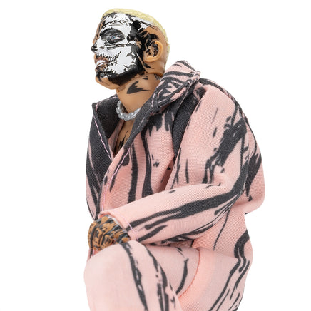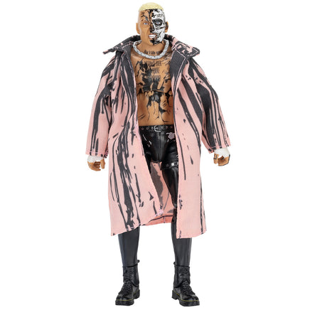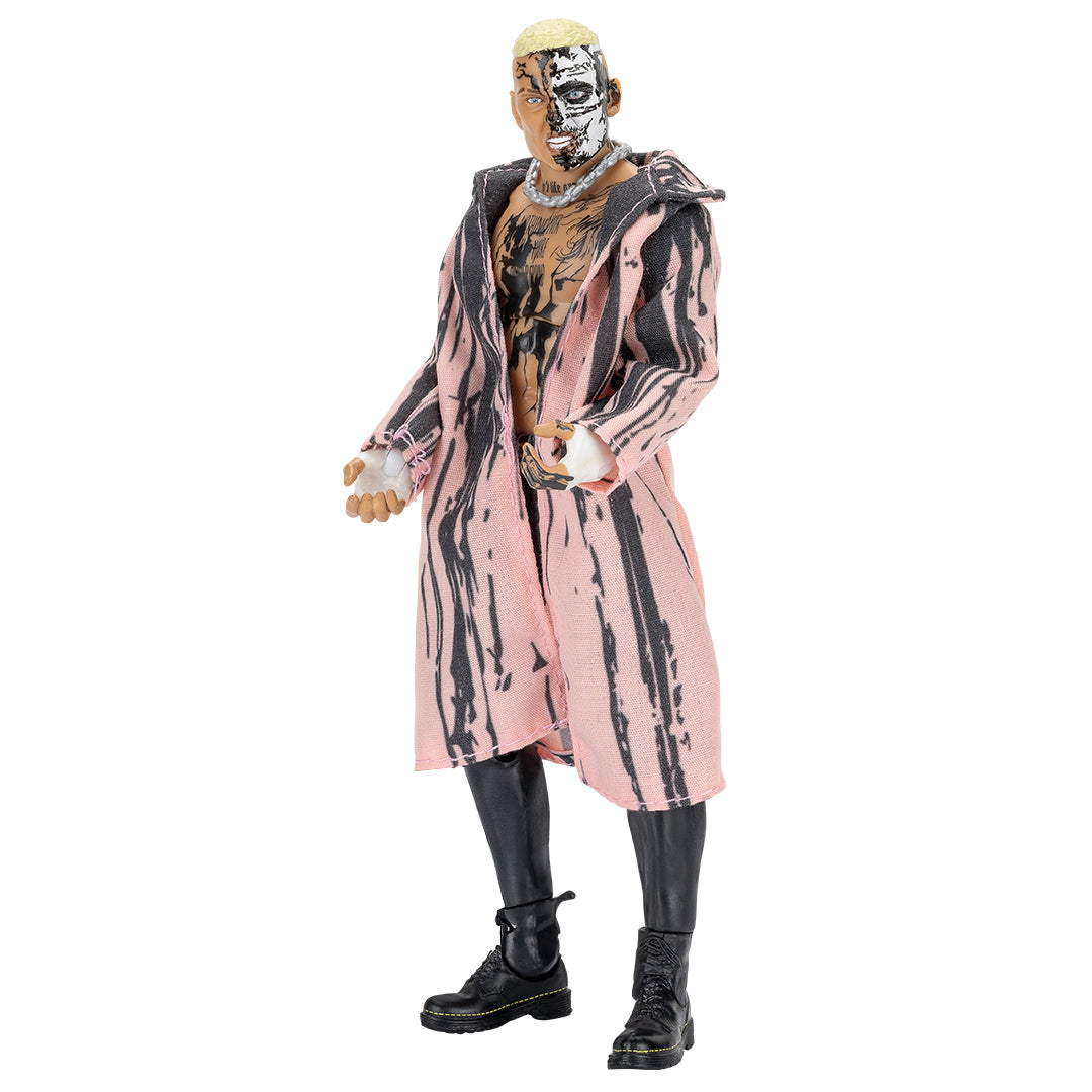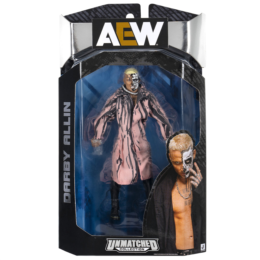 Scale new heights with Darby Allin (Pink Coat) in Jazwares AEW Unmatched Series 11! Allin’s ready to deliver a Coffin Drop with a fearsome headscan featuring half-and-half skull facepaint. He’s wearing torn black cutoff jeans with black tights underneath, as well as black laced boots and white wrapped fists. His look is complete with accurate tattoos, black body paint, and a molded pink entrance coat with black ink splatter design!